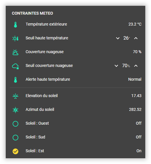 Et pour terminer je vais créer un dernier binary_sensor: pour déterminer les conditions météo. Il s'appuie sur les infos de l'intégration Météo France (ou avec un capteur de luminosité en s'appuyant sur l'exemple de Fabien) et dépend de seuils définis dans des input_number: qui pourront s'afficher dans Lovelace. (je n'ai pas pris en compte la température intérieure pour l'instant).