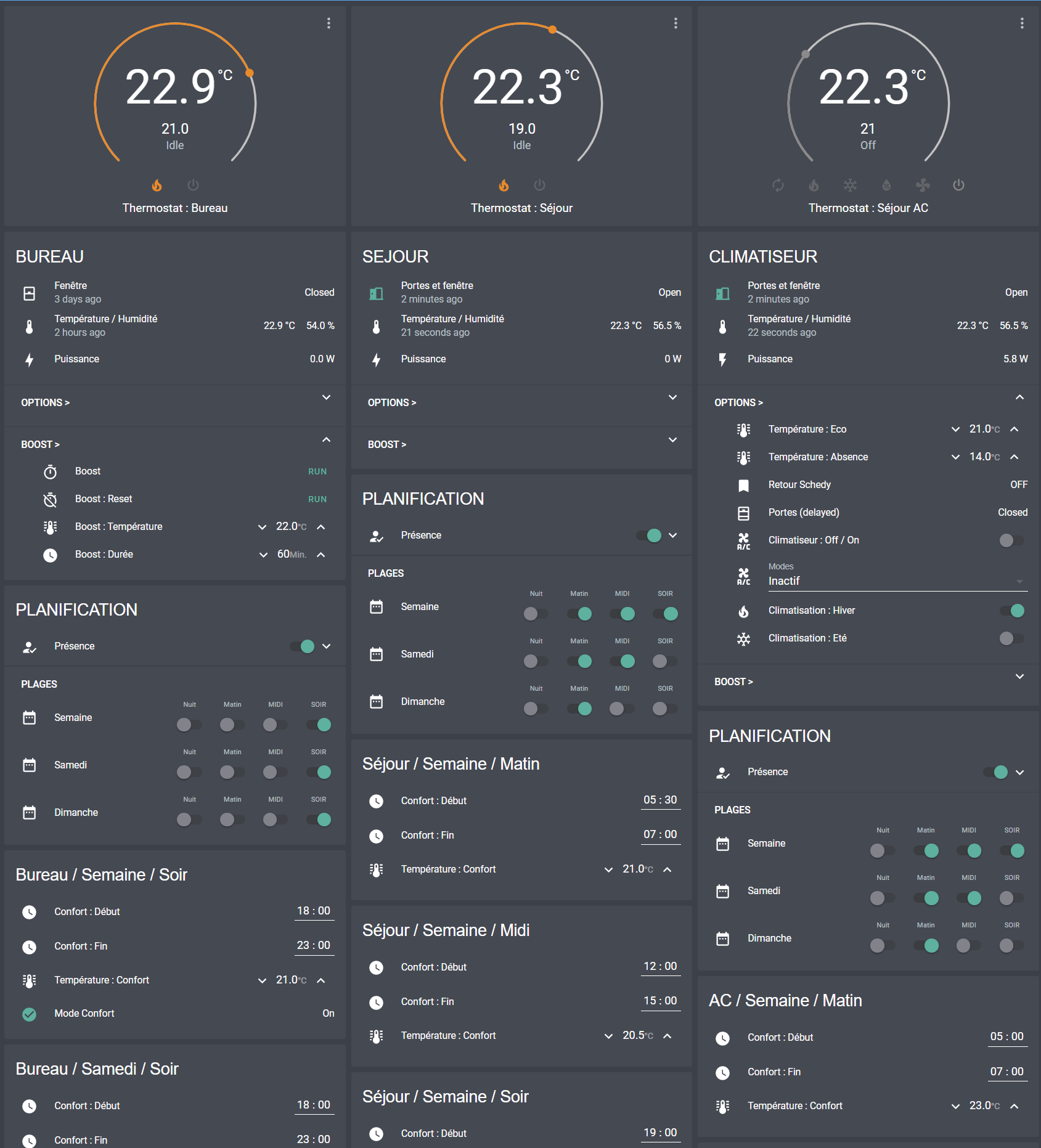 Toutes les plages sont gérés par des binary_sensor via différentes sources (input_datetime, input_number, input_boolean, et d'autres binary_sensor...) et Schedy ne fera qu'affecter la température de consigne correspondant à la plage au thermostat (climate:) quand le binary passera à ON. Il nous faut donc 1 binary par plage, ce qui fait 3 groupes de 4 = 12 pour une pièce. Ces binary constituent la partie centrale, ils risquent donc d'évoluer et je publierait les mise à jour sur GitHub. Ne cherchez pas à recopier ces bouts de code, il ne sont là que pour expliquer la philosophie et proviennent de plusieurs tests, vous trouverez mes sources sur GitHub. et ici pour un second projet plus complet. (je vais essayer de les tenir à jour).