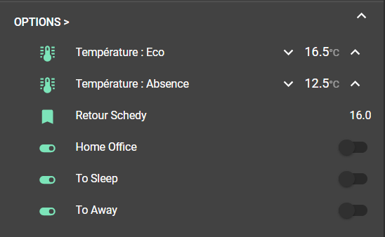 Ensuite si on déroule les options, on retrouve les consignes ECO et ABSENCE, le retour Schedy n'est là que pour du debug, il nous indique l'information reçue par Schedy. Les 3 commutateurs suivant seront des contraintes générales que nous pourrons utiliser ultérieurement dans Schedy.