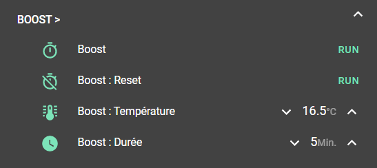 On va ensuite déplier le boost. On choisit ici la température et la durée. Un reset est prévu afin d'annuler un boost lancé malencontreusement.