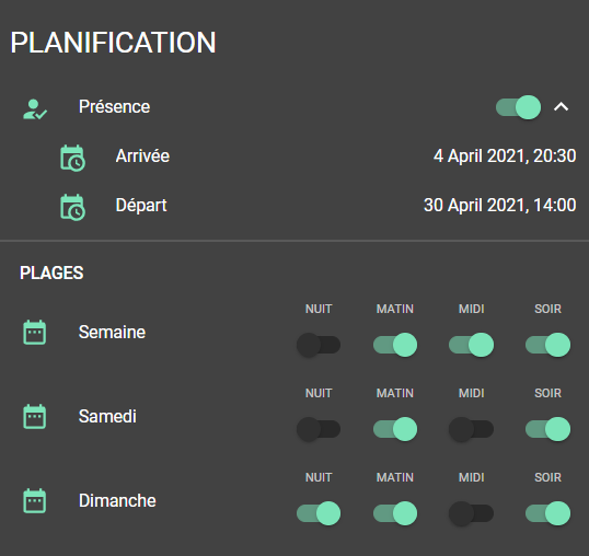 La carte suivante de notre stack est consacrée à la présence de l'occupant (avec ses dates d'arrivée et de départ cachées, sachant que ces dates, principalement liées aux chambres des enfants, pourront être gérées autrement (calendrier scolaire, géoloc sur approche, ...) ainsi que le choix des plages à activer pour chaque type de journée :