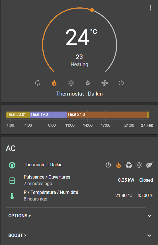 - Et enfin Schedy dont j'ai parlé plusieurs fois ( 1 | 2 ), qui lui ne dispose pas d'interface. On va donc s'en servir de moteur et lui construire une interface Lovelace. En fait j'ai géré ma clim avec tout l'été sur la base de ce que j'avais fait et c'est parfait. Je vais maintenant l'adapter afin d'en faire profiter mon frère, avec d'autres contraintes et le souhait qu'il soit le plus autonome possible.