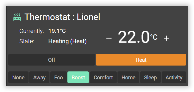 - Boost dynamique : température t pendant n minutes. Utile pour une dérogation temporaire, genre un occupant ne va pas travailler un lundi après-midi, il serait dommage qu'il se gèle...