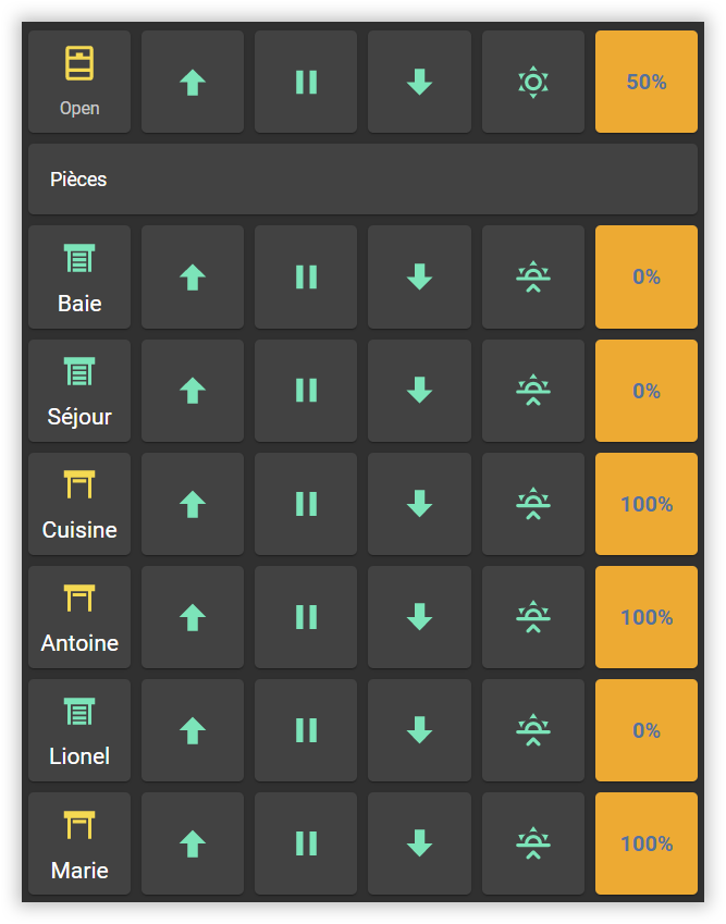 Il ne faut pas que cette interface soit compliquée. J'ai donc choisit de masquer tout ce que n'est pas utile au quotidien. Pour y parvenir j'ai utilisé des cartes conditionnelles, l'intégration Fold-Entity et bien sur Multiple-Entity-Row que j'utilise régulièrement.. Un onglet sera dédié à chaque pièce, onglet dans lequel on trouve deux cartes Vertical Stack. Une première pour les fonctions et informations générales et la seconde ou vont se déplier les plages actives