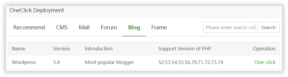 Je vous laisse explorer l'interface qui est plutôt intuitive. Je vais juste prendre un exemple. Imaginons que je veuille installer un Wordpress. Il me suffit d'aller dans l'App Store et de choisir One Click Deployement et de sélectionner Wordpress et aaPanel fera le reste après avoir choisit quelques options de personnalisation :