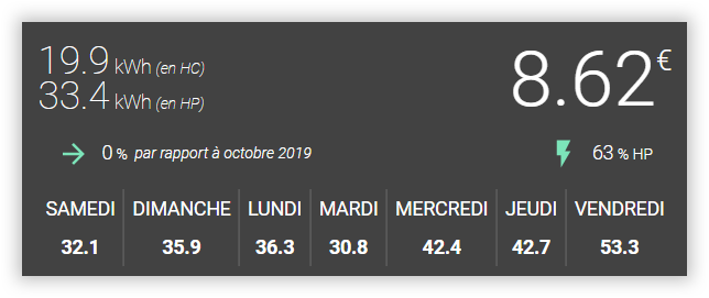 En ce qui me concerne, en prenant par exemple un Shelly 1PM qui pilote un convecteur, ce qui va m'intéresser est de connaitre la consommation cumulée en cours et celle pour le même jour l'an dernier.