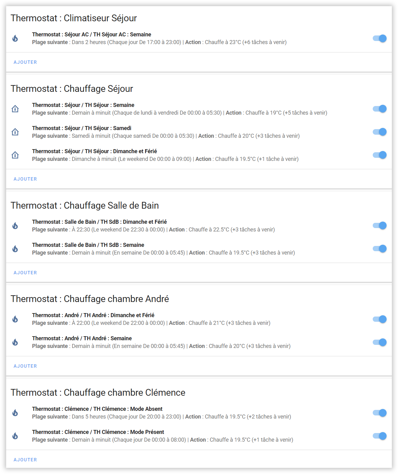 J'utilise ici une carte de la pile pour chaque thermostat et dans chaque carte je vais pouvoir ajoute plusieurs planifications. Par exemple une pour la semaine et une pour les week-end et jours fériés. A noter que workday: est supporté, ce qui simplifie grandement la gestion des jours férié. A droite de chaque planification on a un interrupteur qui permet d'activer ou désactiver la planification, fonction également possible par une automation. On peut également la laisser activée et la soumettre à une condition pour peu qu'on ait associé l'objet idoine, un input_bolean: par exemple...