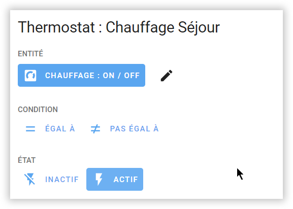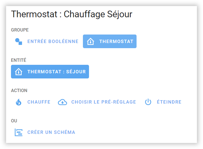 Quand on ajoute une entrée on choisit l'objet sur lequel on peut agir, ici un thermostat, on précise l'entité et le type d'action unique à exécuter (allumer, éteindre plus adapté à d'autres équipements, ou mieux de faire un schéma, ce qui sera pleinement adapté à un thermostat :