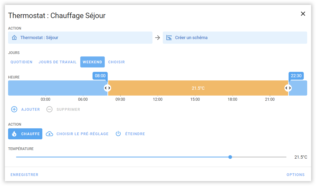 Je prends l'exemple des thermostats qui me préoccupait, mais on peut bien sur planifier tout ce qui est actionnable, directement, via des scripts ou des scènes.