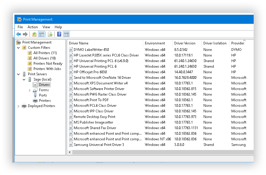 Les utilisateurs de ce genre de logiciels génèrent beaucoup d’impressions. C'est prévu, le client Bureau à distance (Windows et Mac, mais pas celui que l'on trouve sur le Windows Store) permet d'utiliser ses imprimantes locales qu'il redirige dans la session RDP. Si dans la pratique si ça peut fonctionner de façon transparente pour quelques imprimantes qui utilisent des pilotes standards fournis par Windows, dans la majorité des cas il faudra installer les pilotes des imprimantes du poste client sur le serveur, (sauf peut être si on installe RDS avec EasyPrint, ça reste à vérifier et je n'ai pas pris cette peine). Hélas il sera impossible d’installer directement certains pilotes sur le serveur, soit leur module d’installation ne peux fonctionner que sur Windows 10, soit parce qu’il nécessitent que l'imprimante soit en ligne. Il va donc falloir ruser un peu pour disposer des pilotes correspondant aux imprimantes de nos clients sur le serveur.