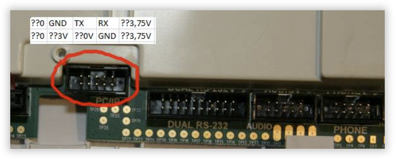 Une fois cette opération réussie (YES ! Ca m'a pris l'après midi...), on peu détacher l'ESP_01 de son support USB et aller le brancher dans la centrale. Il sera alimenté en 3.5 v par elle et servira d'interface TCP/Serie. Visonic a prévu des connecteurs dans la centrale afin d'y connecter des cartes optionnelles et couteuses, sauf que les signaux sont disponibles sur les connecteurs et que les cartes ne servent qu'à supporter des connecteurs... Des petits malins on fait un joli travail de recherche (voir les sources). Le connecteur qui nous intéresse est celui de gauche et en branchant un petit câble Dupont à 4 fils sur les 4 du haut à droite on sortira aisément GND TX RX et les 3.75 v nécessaires à l'alimentation de notre ESP.