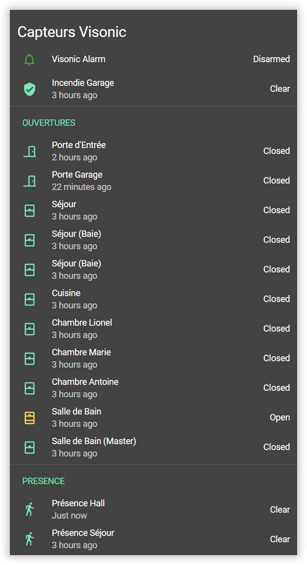 On installe donc l'intégration Visonic, encore un excellent travail d'un passionné, et on renseigne l'IP et le port (23) de notre ESP. Et c'est tout, comme par magie les capteurs remontent ainsi que le panneau de commande. Il sera ainsi possible d'armer et désarmer la centrale depuis Home Assistant (Géoloc, présence pour l'armement et tag NFC pour le désarmement dans mon cas) et de savoir quel capteur à déclenché l'alarme dans une notification (Slack, TG ou SMS), mais aussi de conserver un log (CSV et/ou XML).