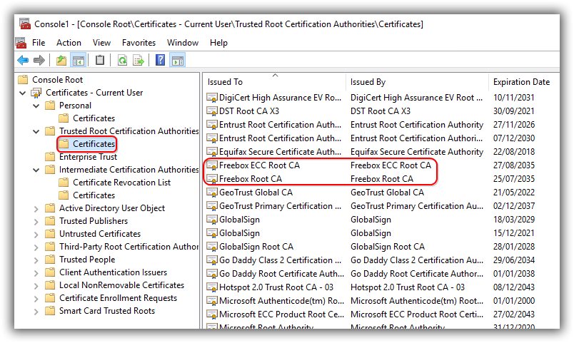 • Freebox ECC Root CA.cer est l'un des deux certificats requis pour accéder à la Freebox en HTTPS.