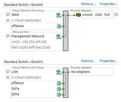 Dans la pratique on installe ESX en quelques clics via la console Online, ensuite on crée sur ESX un LAN qui n’est connecté à aucune carte réseau (on doit pouvoir utiliser le même swich virtuel que pour le WAN avec un VLAN, mais ce serait se compliquer la vie). Dans la console Online on achète une IP Failover, on l’associe au serveur dédié et on lui attribue une adresse MAC que l’on reportera sur le WAN de la VM pfSense. (je trouve le client vSphère plus intuitif que la version web pour faire ce genre de réglages).
