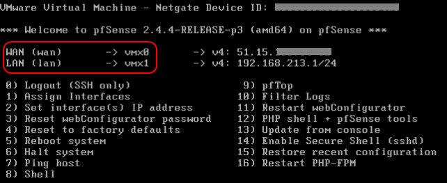 Une fois l’installation terminée, depuis la console ont défini VMX0 sur le WAN et VMX1 sur le LAN et on configure les adresses IP correspondantes, l’IP Failover sur le WAN (SANS GATEWAY, c’est important) et une IP LAN, 192.168.x.1 par exemple et sans passerelle puisque c’est le LAN. On n’active pas le serveur DHCP.