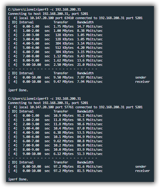 Enfin, Iperf va vous permettre de tester le débit utile. On voit sur la capture suivante une différence significative entre deux tests, sur le second j’ai passé la ram de la VM de 1 GB à 2 GB et de 1 vCPU à 2 vCPU. A vous d’ajuster, mais il ne faut pas perdre de vue que VPN = Crypto et que cela nécessite un peu de ressources…