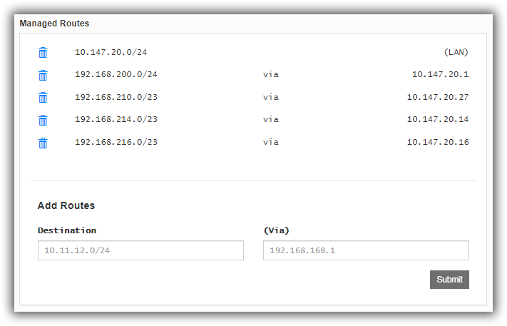 Ensuite on se rend sur my.zerotier.com pour ajouter les routes managées. Vous allez me demander pourquoi certaines sont en /23 et non /24. Simplement parce que si on les laisse en /24, ce qui semble logique, une machine cliente Zerotier (typiquement un PC portable) connectée sur un de ces réseaux ne pourra pas voir le réseau local sans ça.
