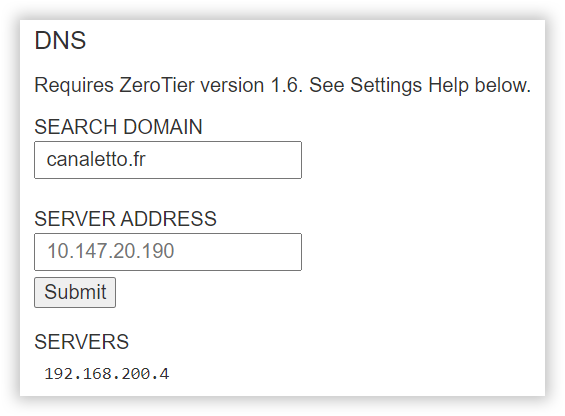 Pour les machines itinérantes se posera la question de la résolution des noms. Ce n’est théoriquement pas compatible RFC, mais rien ne vous empêche dans la pratique de renseigner dans un DNS public des enregistrements de type A associés à des IP privées et ainsi pouvoir joindre facilement les machines du réseau local via une machine ZT…