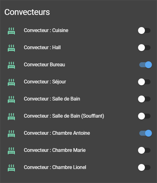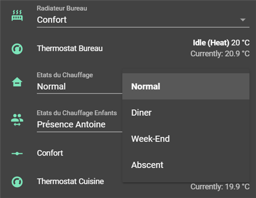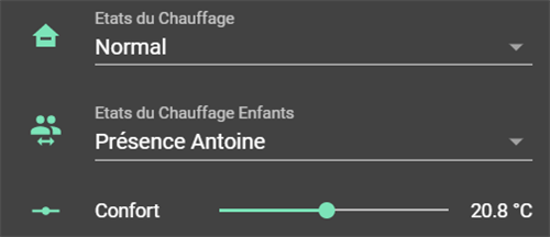 Le second mode est dédié à la présence des enfants, tandis que le troisième sera celui utilisé au quotidien. Et voici ce que ça donne sur l'interface de HA.