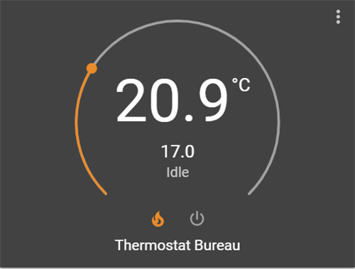 Une fois que notre thermostat est installé il faut relancer HA. C’est une des plaies de HA, pour l'instant et on passe pas mal de temps à relancer. D’où l’intérêt qu'il soit installé sur une machine un peu puissante. On peut ensuite aller sur la page d’accueil de HA pour y ajouter le thermostat, en passant en mode configuration, en haut à droite, et obtenir ce joli visuel, tant sur votre desktop que via l'application mobile, qui du reste est un pur bonheur quand on pense à l'application mobile (payante) de Jeedom. Il existe des variantes possible de présentation et de customisation.