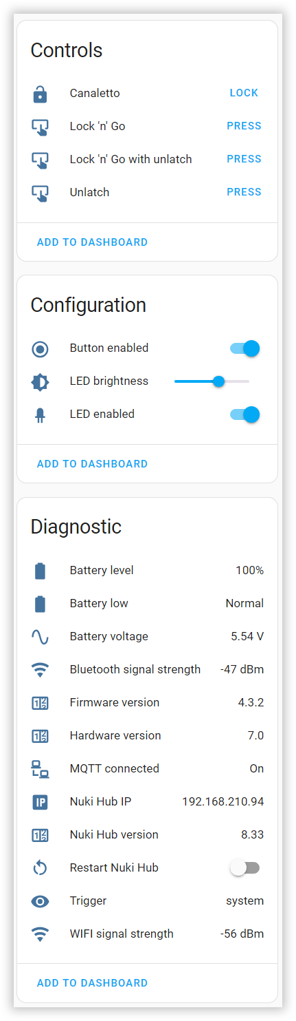 Un petit flash plus loin j'ai réussit à associer mon Nuki à ce bridge DIY, il remonte toutes les informations utiles, voire plus, et surtout il permet de verrouiller / déverrouiller rapidement la serrure, ce qui est tout de même la base.