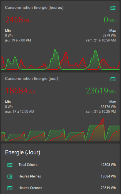 Avec tout cela vous pouvez avoir le suivi d'énergie journalier global de votre installation avec ces sensors. A coupler avec un utility_meter pour avoir le suivi. Il est possible d'y associer le coût, en ajoutant à HA les informations de votre abonnement (la séparation HC/HP est faites pour ça !)