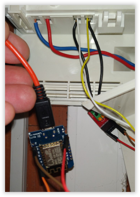 On n'oublie pas d'alimenter le Wemos en USB bien sûr. Le tout fonctionne donc en 3,3V et est alimenté par un simple câble micro-USB (5V). Il est également possible de s'alimenter sur la sortie idoine low voltage directement sur le compteur, mais dans ce cas cela nécessitera un convertisseur. A noter que si le compteur est situé en dehors du domicile, il sera souvent possible d'utiliser l'ancien câble servant au HP/HC pour y faire transiter les information série (les commandes HP/HC pouvant avantageusement être gérées par Home Assistant).