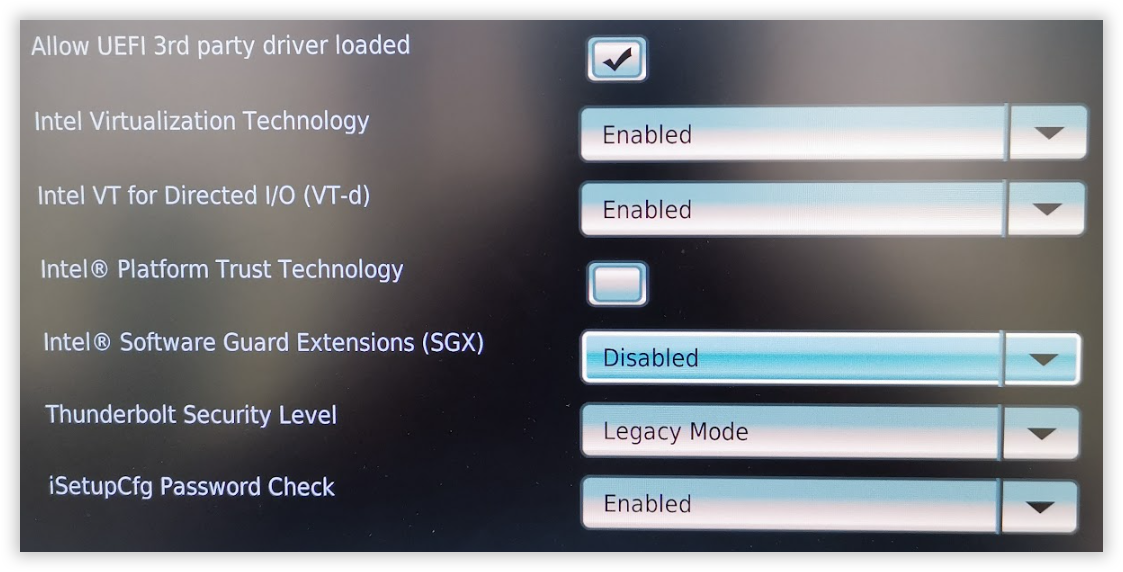 J'ai fini par trouver que pour booter sous Ubuntu il fallait désactiver TPM et SGX. Ca ne s'invente pas mais j'ai fini par pouvoir booter mon Ubuntu Live.