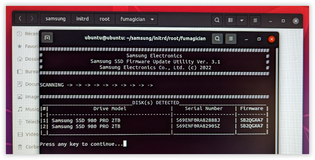 Une fois sur le desktop de mon Ubuntu je copie l'ISO de mise à jour (Samsung_SSD_980_PRO_5B2QGXA7.iso) que j'ai au préalable préparée sur une autre clé USB vers le répertoire Home et je monte le volume. Ensuite toujours depuis l'interface graphique j'extrait le fichier initrd un répertoire (/home/samsung par exemple). Ensuite je vais jusqu'à /home/samsung/initrd/root/fumagician et je peux lancer la mise à jour de mes SSD :